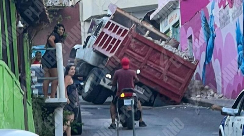 Un camión de volteo cargado con escombro cayó en un socavón sobre la calle Vicente Guerrero, en el barrio Las Crucitas, en el Centro de Acapulco.