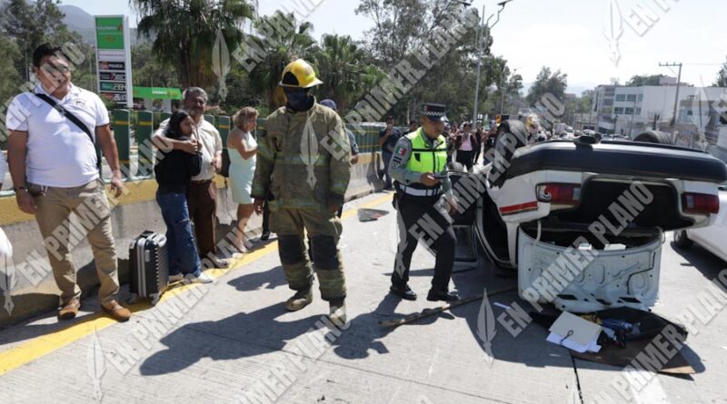 Posteriormente, el taxi se impactó contra el muro divisorio de concreto y finalmente se volcó.