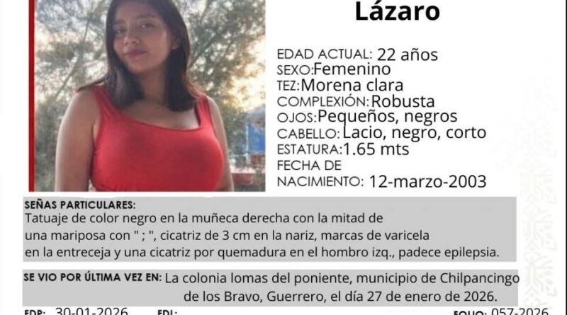 Desde el pasado 27 de enero, la estudiante de segundo año de la Facultad de Derecho de la Universidad Autónoma de Guerrero (Uagro), Raquel Martínez Lázaro, está desaparecida por lo que sus familiares le piden a las autoridades de la Fiscalía General del Estado (FGE) que realicen su búsqueda y localización.