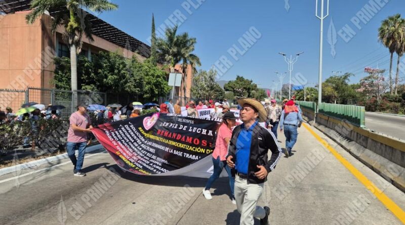 Integrantes de la planilla roja del Sindicato Único de Servidores Públicos del Estado de Guerrero (Suspeg) y dos secciones de jubilados y pensionados, marcharon para denunciar que una juez resolvió revocar la suspensión provisional de la toma de nota a Javier del Carmen Velázquez Pat, secretario general y ex candidato de la planilla verde en el pasado proceso electoral.
