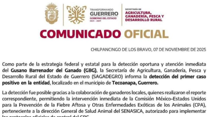 La Secretaría de Agricultura, Ganadería, Pesca y Desarrollo Rural (Sagadegro) informó que el caso de Gusano Barrenador del Ganado (GBG) detectado en el municipio de Tecoanapa se encuentra bajo control y sin indicios de dispersión, tras la intervención de autoridades estatales y federales.