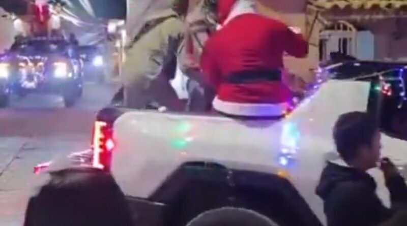 Otro hombre delgado vestido de Santa Claus va caminando y a un lado aparecen dos hombres con armas largas. Varias mujeres y hombres observan como van pasando las camionetas.