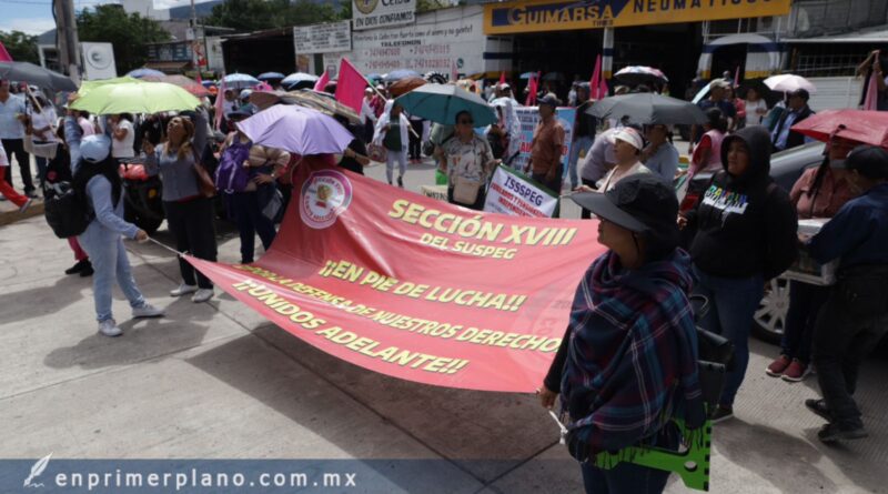 Integrantes de la sección 18 del Sindicato Único de Servidores Públicos del Estado de Guerrero (Suspeg) marcharon al sur de Chilpancingo para exigir una mesa de trabajo con autoridades estatales y diputados locales.