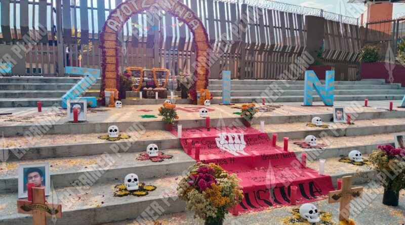 Estudiantes de la Escuela Normal Rural Raúl Isidro Burgos de Ayotzinapa colocaron este sábado una ofrenda en memoria de sus compañeros asesinados en distintos hechos, como parte de las conmemoraciones del Día de Muertos.