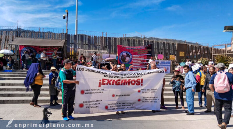 Los manifestantes bloquearon el acceso principal de Palacio de Gobierno para exigir el pago de sus pensiones de octubre. Denunciaron que la falta de aportaciones al ISSSPEG afecta a más de 7 mil 200 beneficiarios en el estado