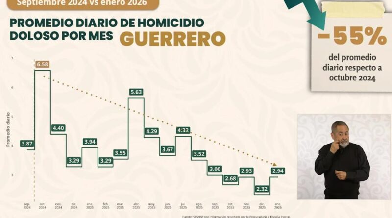 El gobierno federal reportó que Guerrero pasó de 6.58 a 2.94 homicidios diarios, lo que representa una baja significativa del 55 por ciento